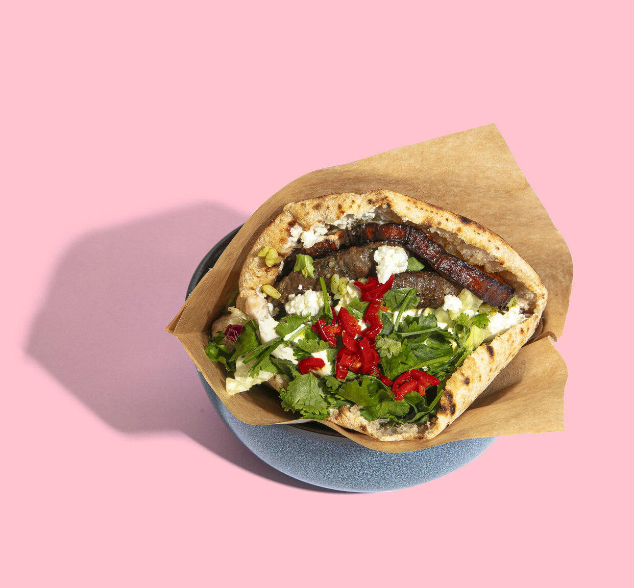 Beef patty (finnish beef, onion, garlic, coriander, parsley, salt, cheese cumin, black pepper),pita bread (water, WHEAT FLOUR, SUGAR, WHEAT GLUTEN, yeast, salt, preservative(E202)) ,feta, tzatziki (YOGURT, cucumber, garlic, mint, salt), tomato, cucumber, olive, eggplant, table (bulgur (WHEAT), red onion, parsley, lemon juice, salt, white pepper), salad, chili, coriander.