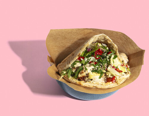 Pita bread (water, wheat flour, sugar, wheat gluten, yeast, salt, preservative (E202)), chicken (Meat origin - Finland, chicken meat, water, rapeseed oil, garlic, salt, preservative (E211), herbs, black pepper), hummus (chickpeas, water, olive oil, sesame paste, sea salt, garlic, cumin, lemon juice, white pepper), tomato, cucumber, matbuha (tomato, rapeseed oil, chili, garlic, paprika, sugar), cabbage, pickles, salad, tahini (sesame paste, water, salt, lemon juice), chili & parsley.