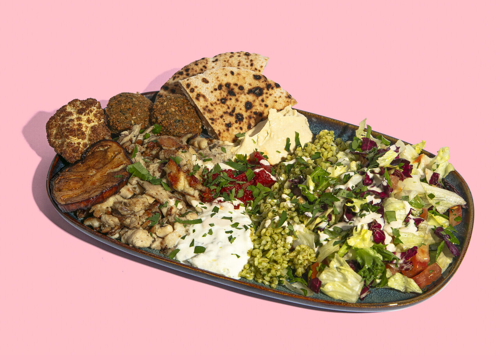 Chicken, falafels, salad mix, hummus, tzatziki, matbuha, eggplant, cauliflower, tabbouleh, tahini & parsley.