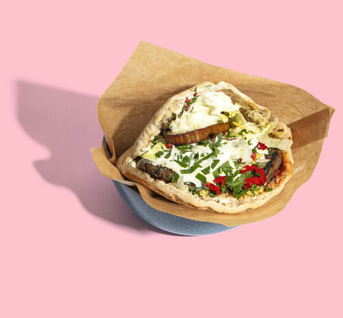 Beef patty, tzatziki (YOGURT, cucumber, garlic, mint, salt), matbuha (tomato, vegetable oil (rapeseed), eggplant, tomato, cucumber, tabule (bulgur (WHEAT), red onion, parsley, lemon juice, salt), lettuce, parsley.