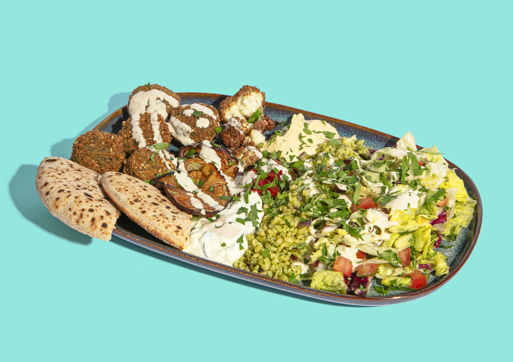 Falafels, salad mix, hummus, tzatziki, matbuha, eggplant, cauliflower, tabbouleh, tahini & parsley.