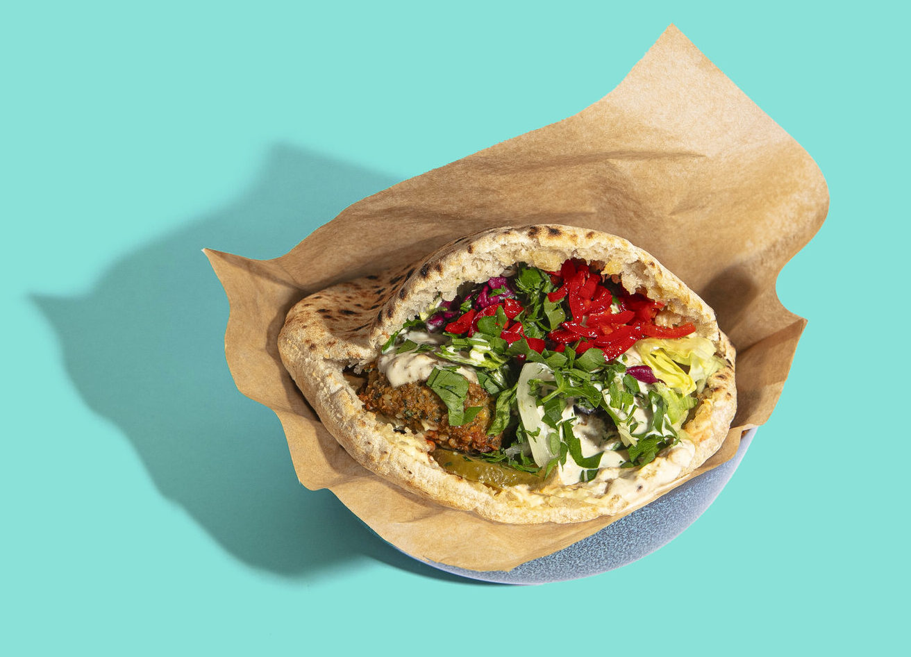Falafel (chickpeas, water, onion, parsley, coriander, garlic, cumin, salt, sesame seeds, baking soda, preservative (E202)), pita bread (water, wheat flour, sugar, wheat gluten, yeast, salt, preservative (E202)), hummus (chickpeas, water, olive oil, sesame paste, sea salt, garlic, cumin, lemon juice, white pepper), tomato, cucumber, matbuha (tomato, rapeseed oil, chili, garlic, paprika, sugar), cabbage, pickles, salad, tahini (sesame paste, water, salt, lemon juice), chili, parsley.