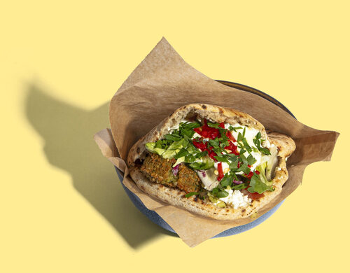 (water, wheat flour, sugar, wheat gluten, yeast, salt, preservative (E202)),feta, eggplant, tzatziki (yogurt, cucumber, garlic, mint, salt), cucumber, tomato, tabule (bulgur (wheat), red onion, parsley, lemon juice, salt, white pepper), salad, kalamata olive paste & parsley.