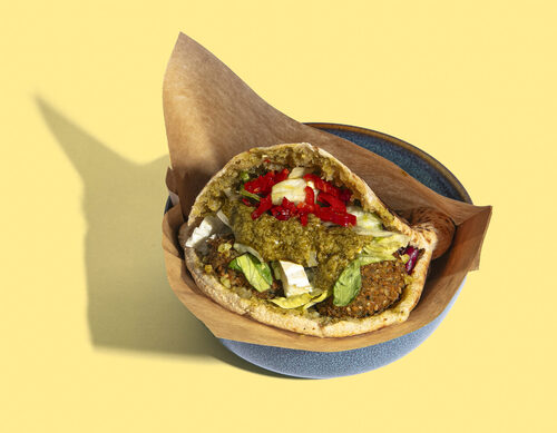 Falafel (chickpeas, water, onion, parsley, coriander, garlic, cumin, salt, sesame seeds, baking soda, preservative (E202)), pita bread
