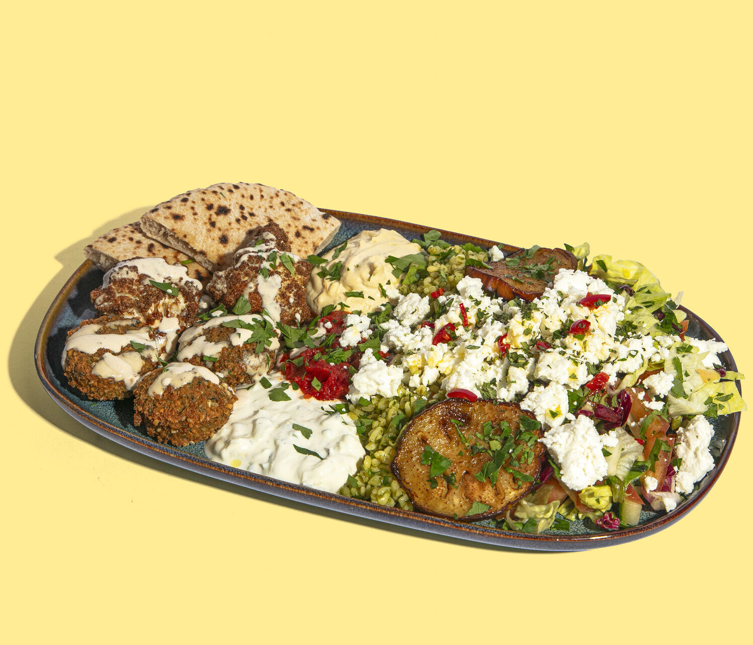 Feta, falafels, salad mix, hummus, tzatziki, matbuha, eggplant, cauliflower, tabbouleh, tahini & parsley.