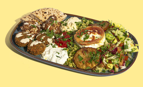 goat cheese, falafels, salad mix, hummus, tzatziki, matbuha, eggplant, cauliflower, tabbouleh, tahini & parsley.