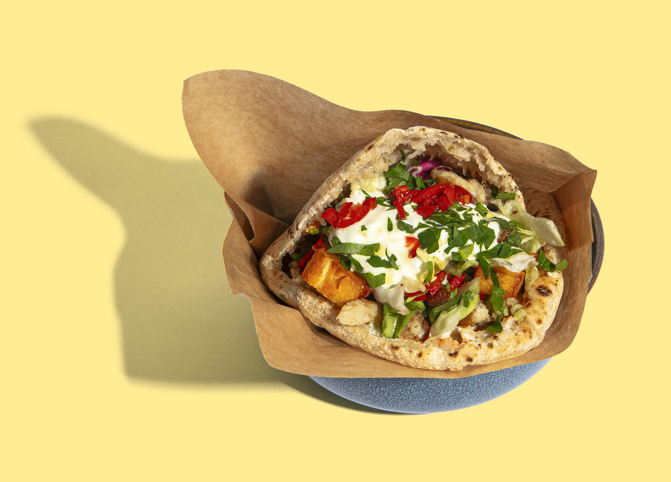 Chicken (Meat origin - Finland, chicken meat, water, rapeseed oil, garlic, salt, preservative (E211), herbs, black pepper), halloumi, pita bread (water, wheat flour, sugar, wheat gluten, yeast, salt, preservative (E202)),hummus (chickpeas, water, olive oil, sesame paste, sea salt, garlic, cumin, lemon juice, white pepper), tzatziki (yogurt, cucumber, garlic, mint, salt), cucumber, tomato, matbuha (tomato, rapeseed oil, chili, garlic, paprika, sugar, salt), tabule (bulgur (wheat), red onion, parsley, lemon salt, white pepper), lettuce, chili & parsley.