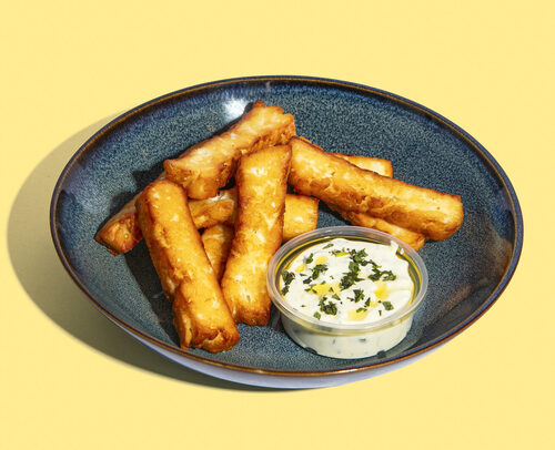 Halloumi (contains lactose, pasteurized), tzatziki (yogurt, cucumber, garlic, mint, salt) & parsley.