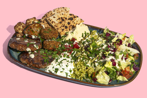 lamb, falafels, salad mix, hummus, tzatziki, matbuha, eggplant, cauliflower, tabbouleh, tahini & parsley.