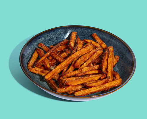 French fries (sweet potato, sunflower oil), tzatziki (yogurt, cucumber, garlic, mint, salt) & parsley.